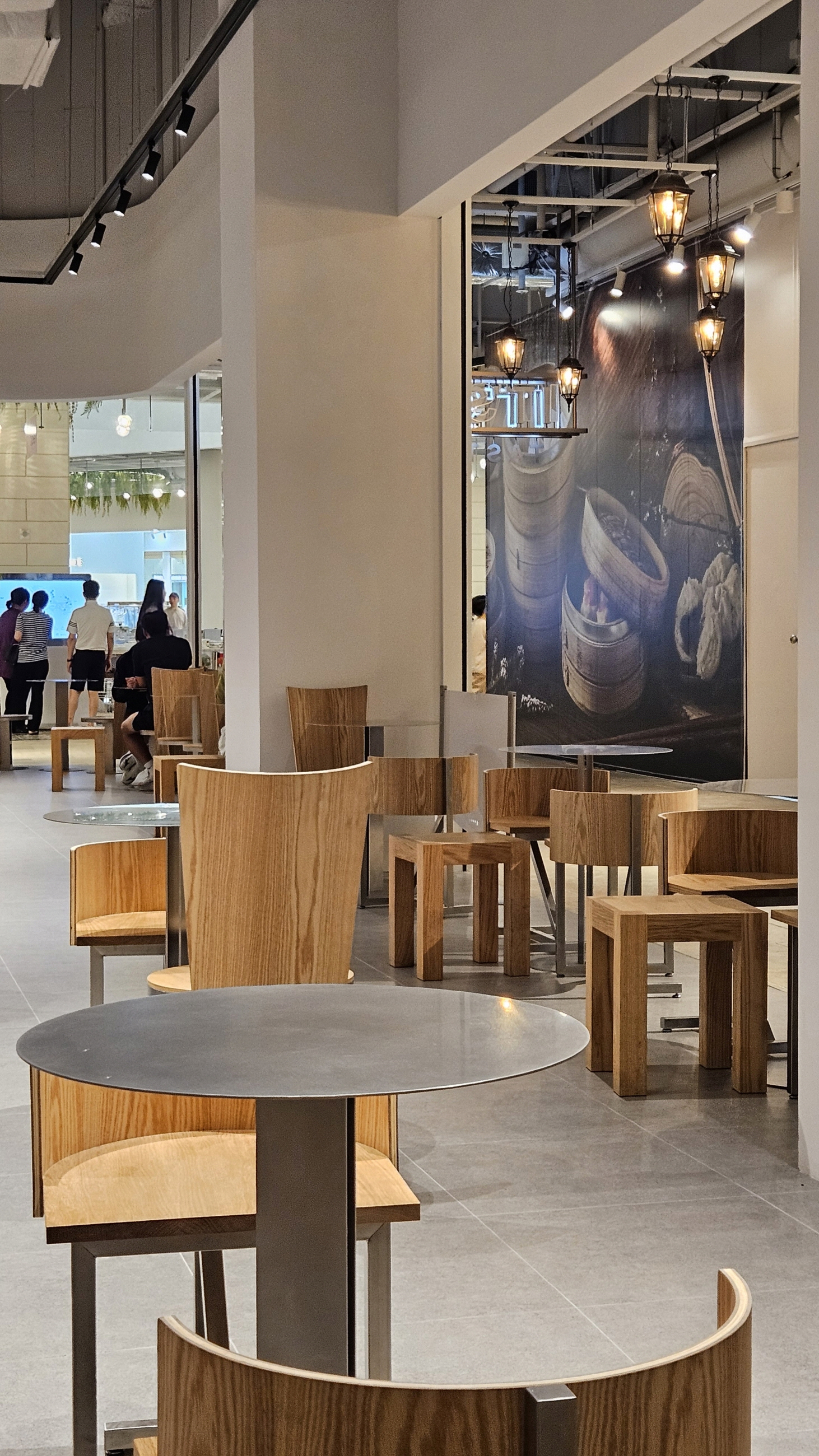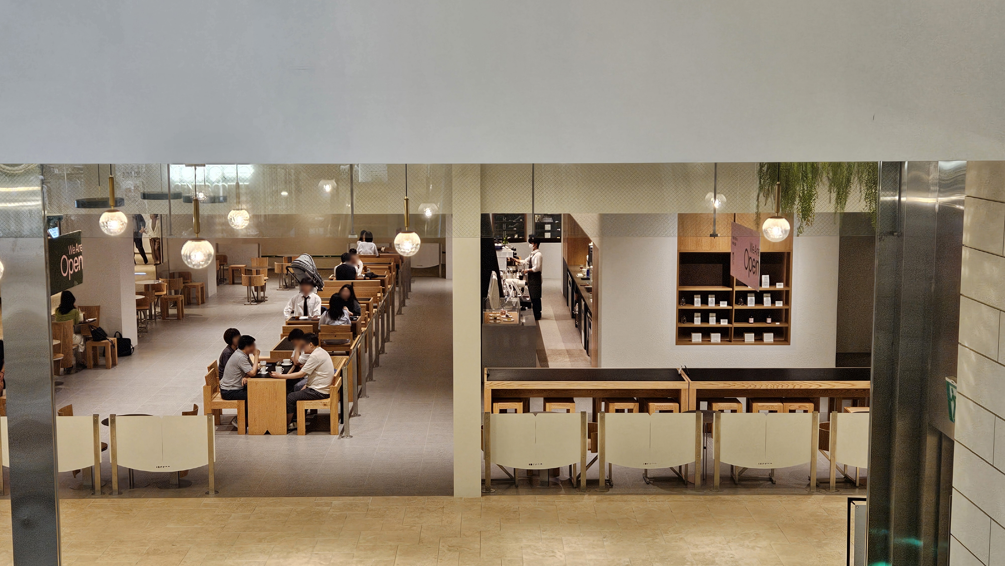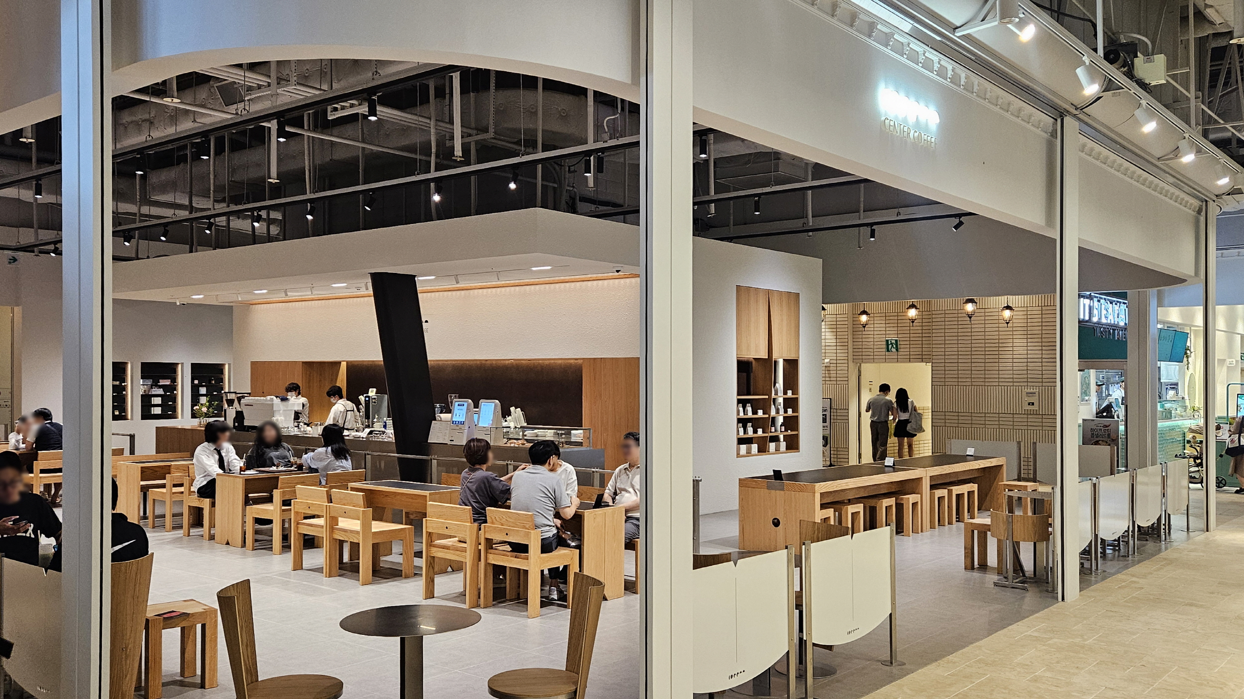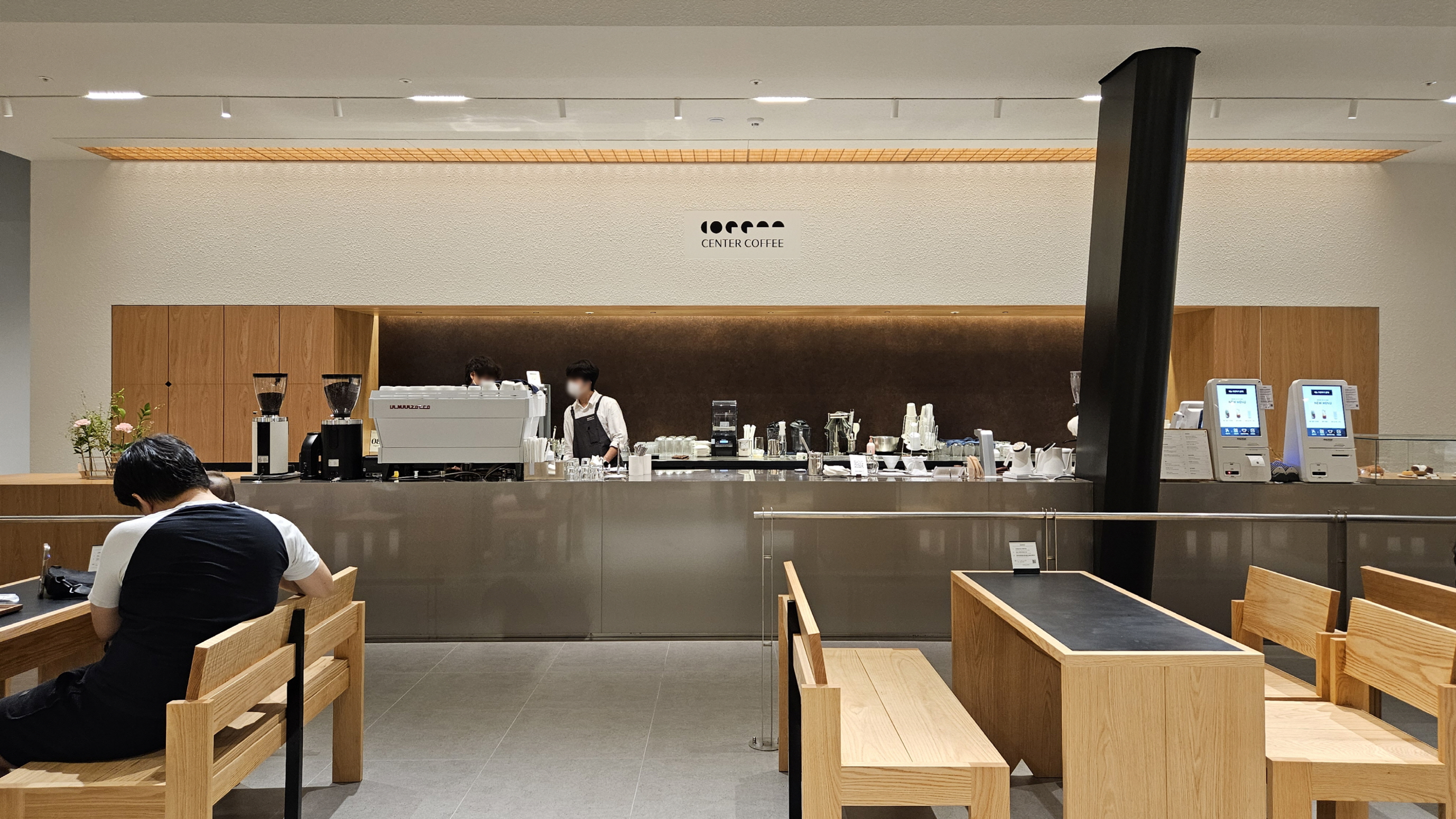 센터커피는 이 구조 안에서 '눈에 띄되 나서지 않는 방식'으로 공간을 풀어낸 듯해 보입니다. 에스컬레이터에서 바로 보이는 시점에 자연스럽게 시야를 차지하는 테이블과 좌석 배치는 이 공간이 갖고 있는 개방성과 잘 어우러지면서도, 매장의 존재감을 뚜렷하게 드러냅니다.
