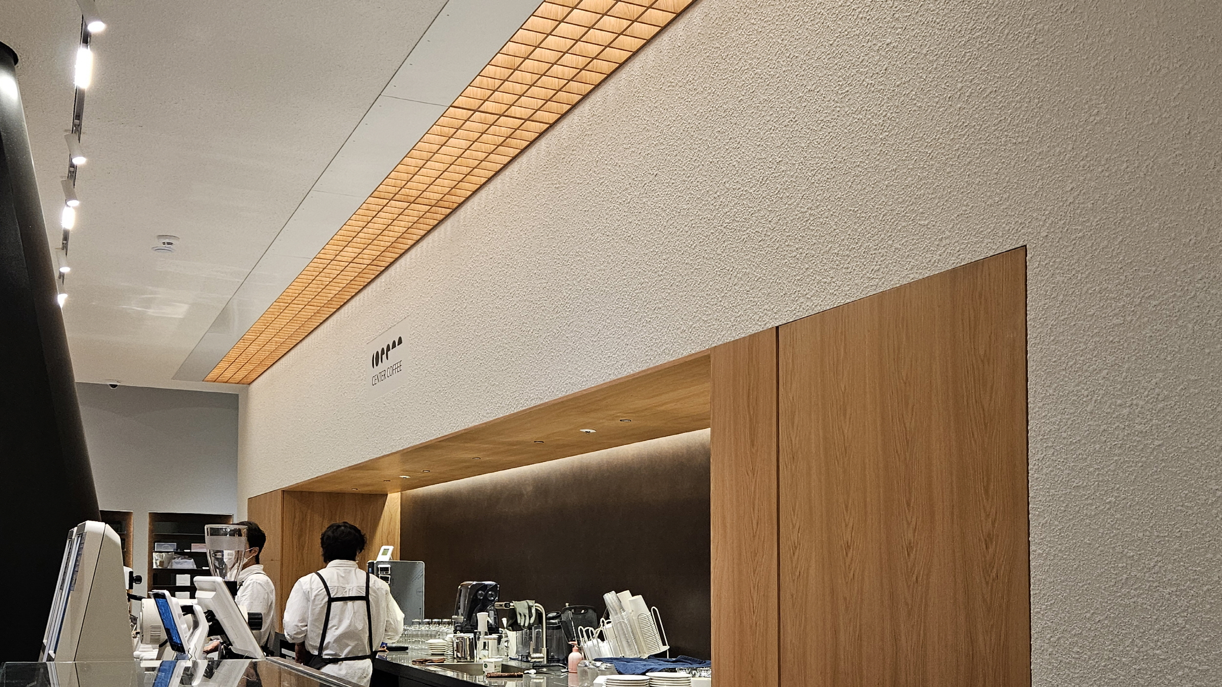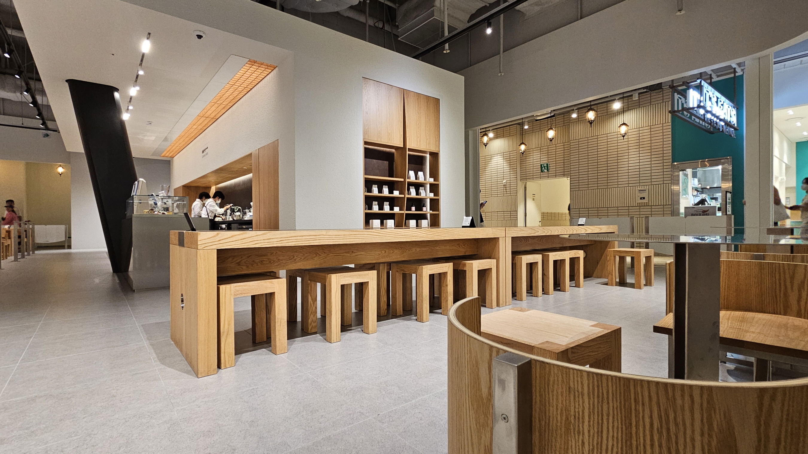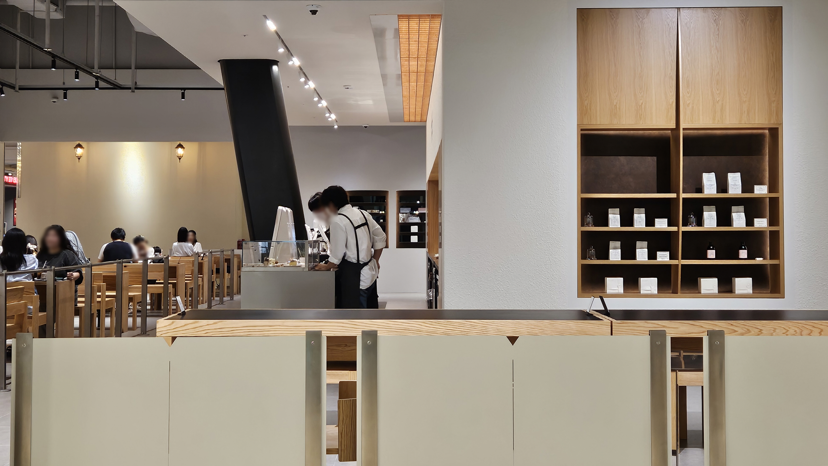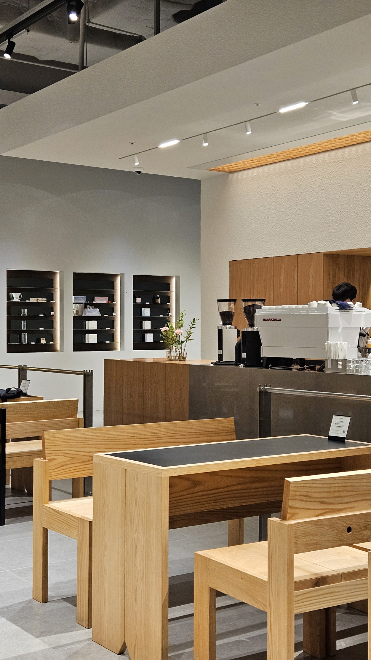 처음 눈에 띄는 것은 긴 바 테이블입니다. 매장을 가로질러 길게 뻗은 이 테이블은 공간 전체의 리듬을 만들어냅니다. 방문자들은 이 흐름에 따라 자연스럽게 움직이고 머무르게 되죠. 또한 높낮이를 달리한 구조나, 세심하게 설계된 좌석들이 이어지며 공간에 안정감과 방향성을 부여합니다. 이 매장은 누군가의 시선을 끌기 위한 요소들보다는, 조용하게 질서를 잡고 사용하는 사람에게 집중된 설계가 돋보입니다.