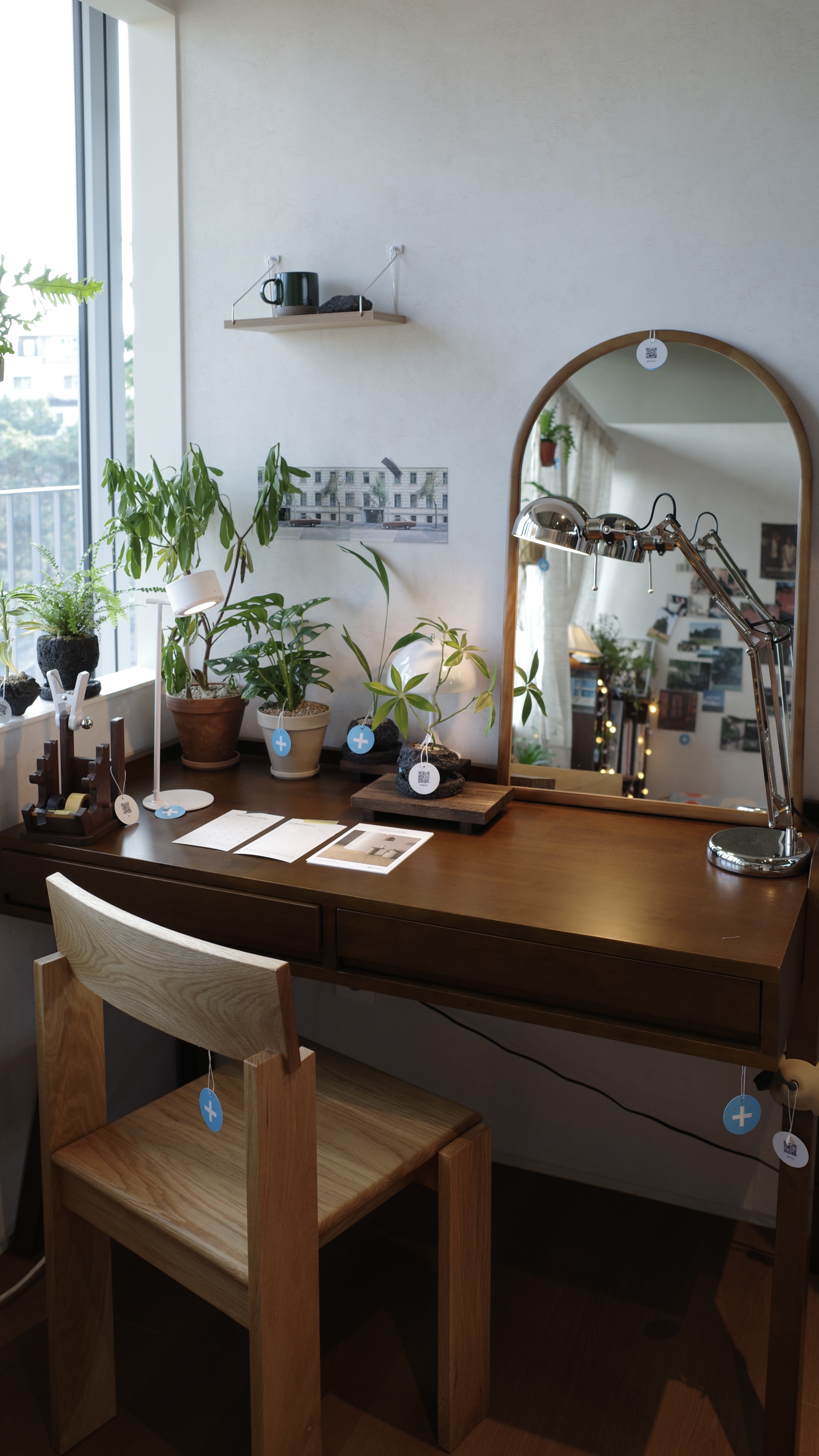 특히 모든 제품 옆에는 오늘의집 앱에서 익숙한 플러스(+) 태그와 QR코드가 함께 부착되어 있어, 공간을 체험하고, 정보를 탐색하고, 온라인으로 자연스럽게 연결되는 흐름이 끊기지 않고 이어집니다. 오프하우스가 단순한 브랜드의 ‘쇼윈도’가 아니라, 디지털 플랫폼의 연장선에 있는 ‘체험형 인터페이스’로 설계되었음을 느낄 수 있죠! |