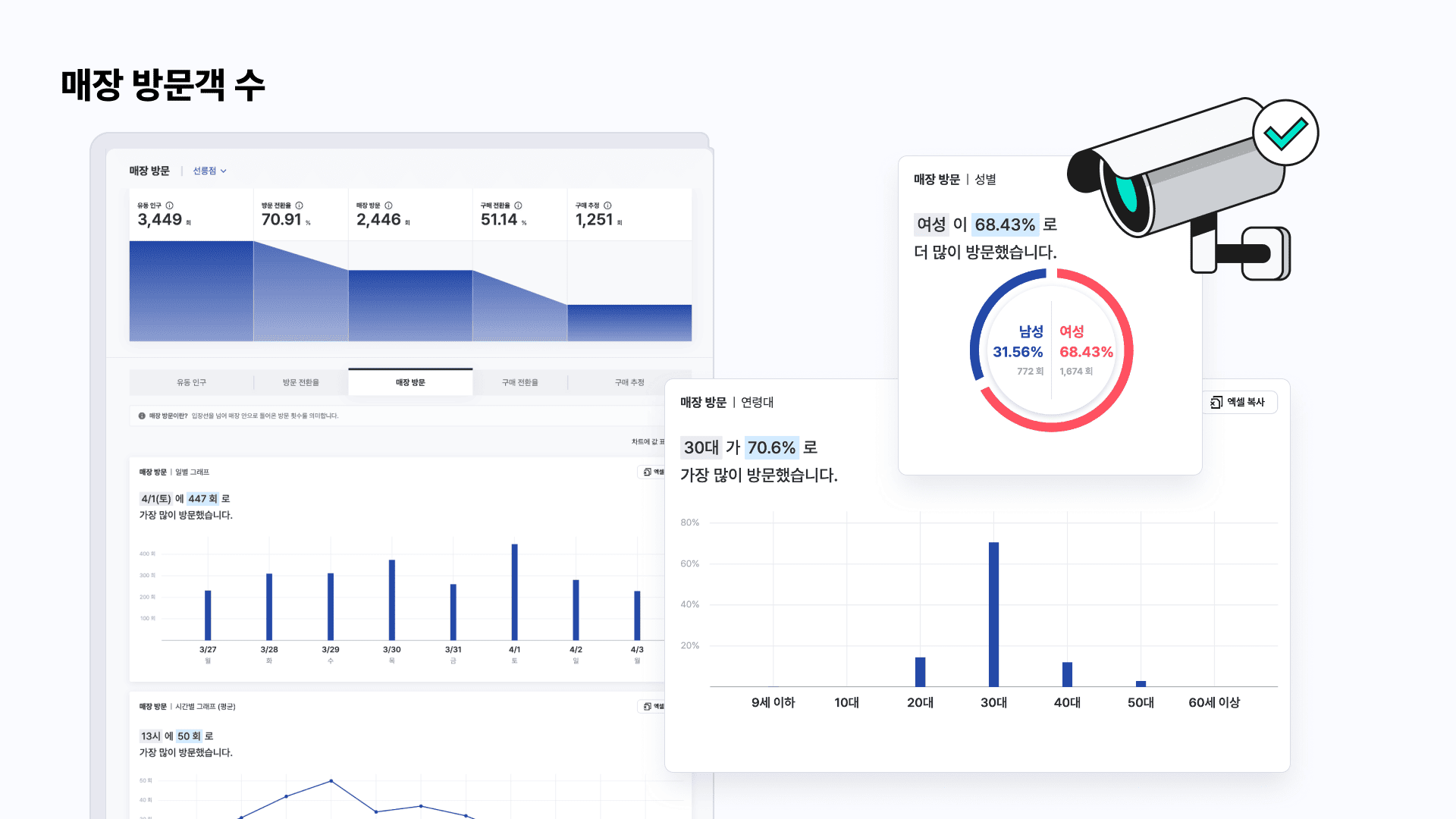 방문객 수는 매장에 방문하는 고객의 수를 말합니다. 오프라인 리테일 환경이라면 어디든 측정하는 가장 기본적인 데이터입니다. 기존의 피플 카운터가 출입문을 드나드는 사람 수를 단순히 세는 데 그쳤다면, 매쉬는 방문객의 성별과 연령대까지 파악합니다. 시간대별, 요일별 방문객 추이도 정확히 측정합니다.