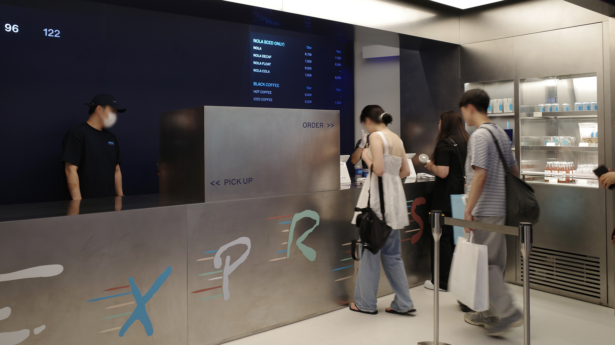 그래서인지 블루보틀은 새로운 실험을 시작했습니다. ‘블루보틀 서울역 놀라 팝업 카페’를 오픈한 것이죠. 더 나아가 블루보틀 브랜드 역사상 처음으로 선보인 테이크아웃 전용 매장이라는 점에서 의미가 더욱 큽니다. 기존의 넓고 여백 있는 구조와 달리 최소화된 공간으로 설계되어, 빠르게 커피를 픽업하는 장면을 자연스럽게 연출합니다. 머무는 공간에서 흘러가는 동선을 겨냥하는 방식으로 바뀐 것이죠.