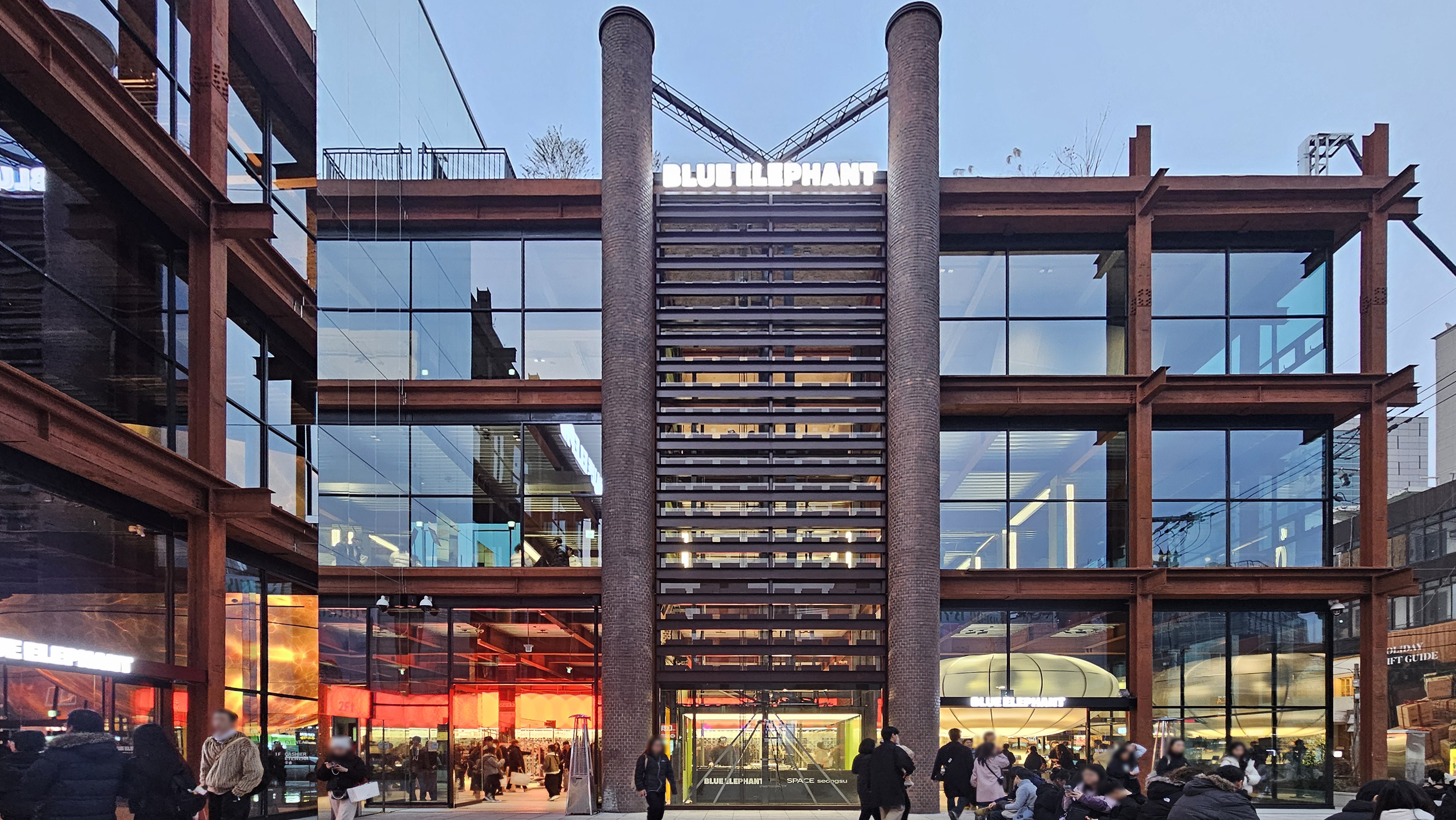 통상적인 리테일 매장은 '문'이라는 경계를 통해 외부와 내부를 정의하고 분리합니다. 그렇기에 매장의 문을 열고 들어서는 순간부터 고객은 손님이라는 역할을 부여받고, 무언가 사야 한다는 심리적 부채감을 느끼게 되죠. 하지만 '스페이스 성수'는 이 경계를 의도적으로 지워버렸습니다. 건물 앞의 작은 광장으로 들어서 안이 들여다보이는 건물을 바라보고 있노라면 사람들은 이미 블루엘리펀트의 영역에 사실상 들어온 셈입니다. 1층부터 최상층과 루프탑까지 이어지는 개방형 구조와 통유리 파사드는 거리의 흐름을 매장 안으로 그대로 끌어들이죠.