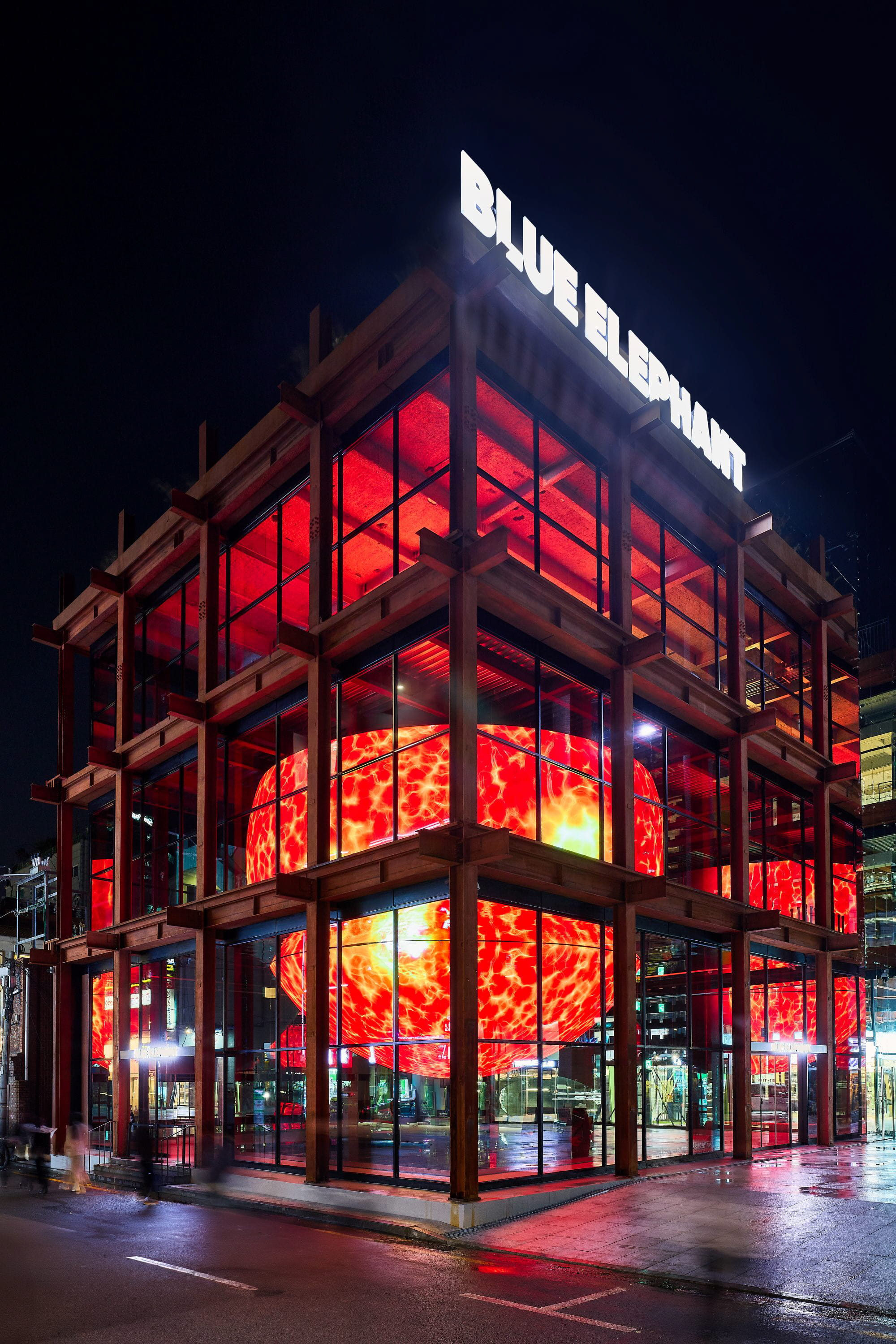성수동 연무장길, 붉은 벽돌과 콘크리트가 어우러지는 익숙한 하이 스트리트의 풍경 사이에서, 또 하나의 새로운 도전적인 균열이 목격됐습니다. 길 한복판 ㄱ 자로 꺾인 형태의 건물이 앞의 작은 광장을 만들어내고, 한편 건물 내부에는 층들의 경계가 사라진 듯 지름 12m의 거대한 금속 구(sphere)가 색을 바꾸며 회전하고 있는 풍경.