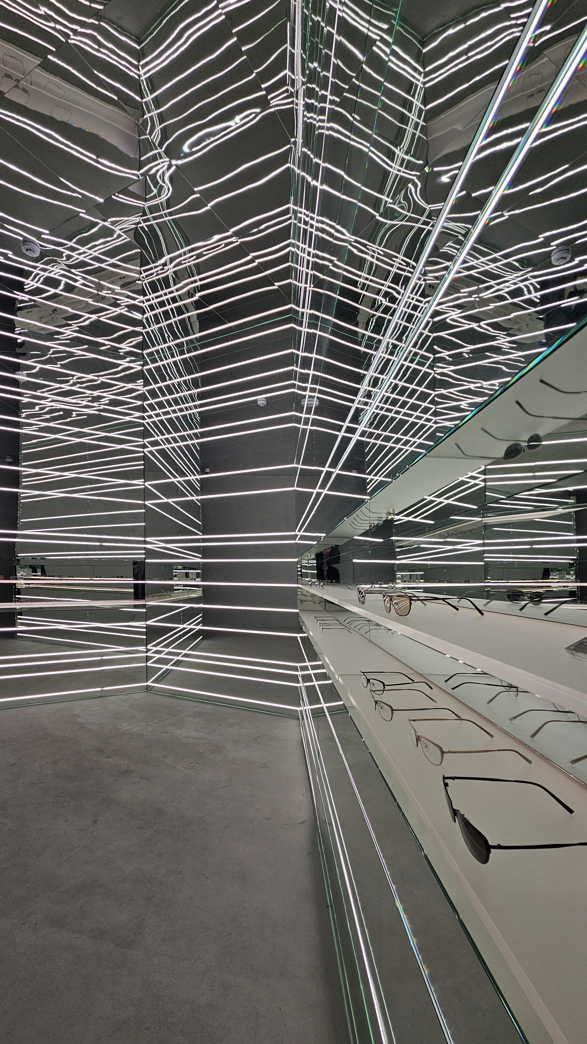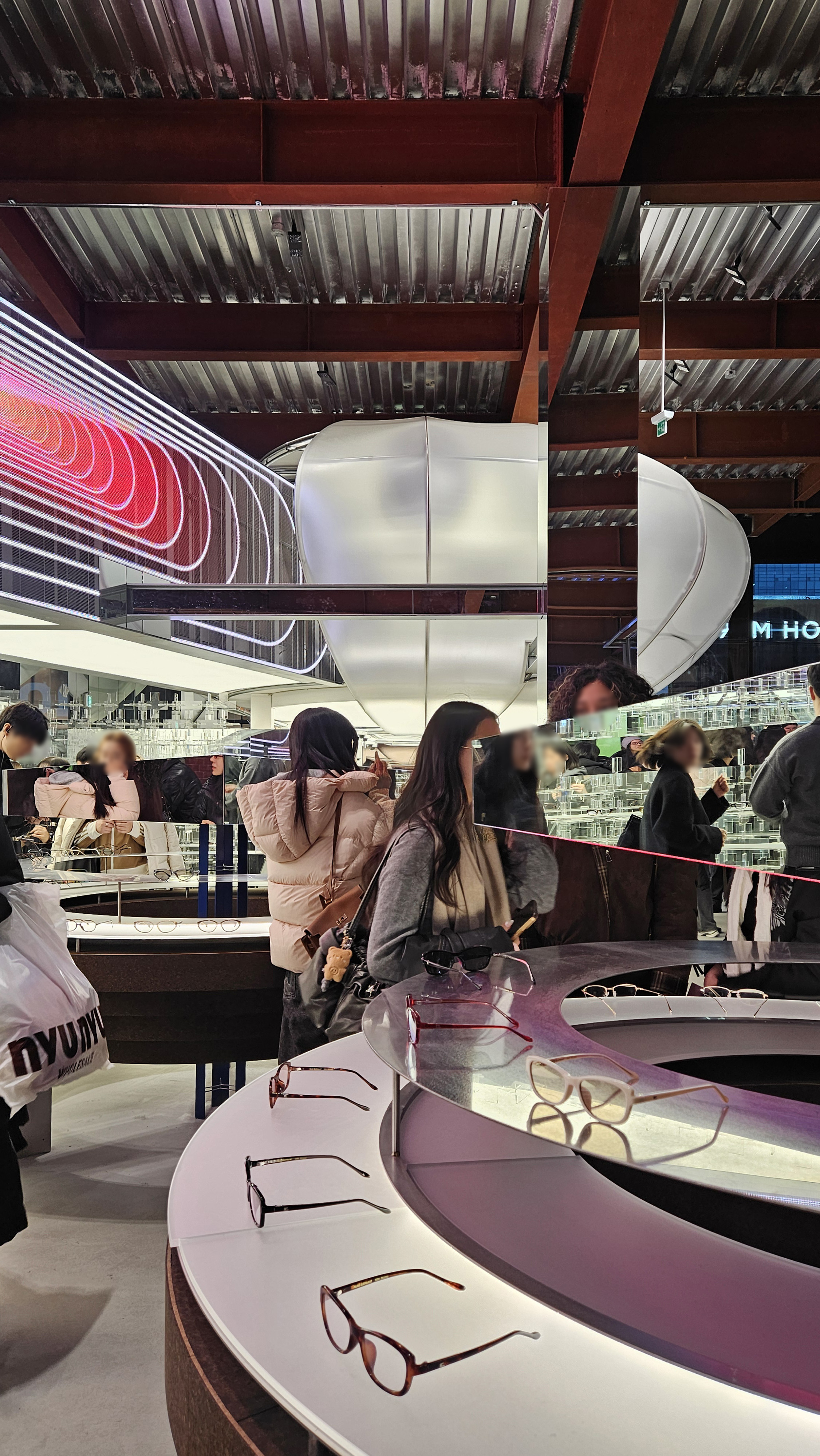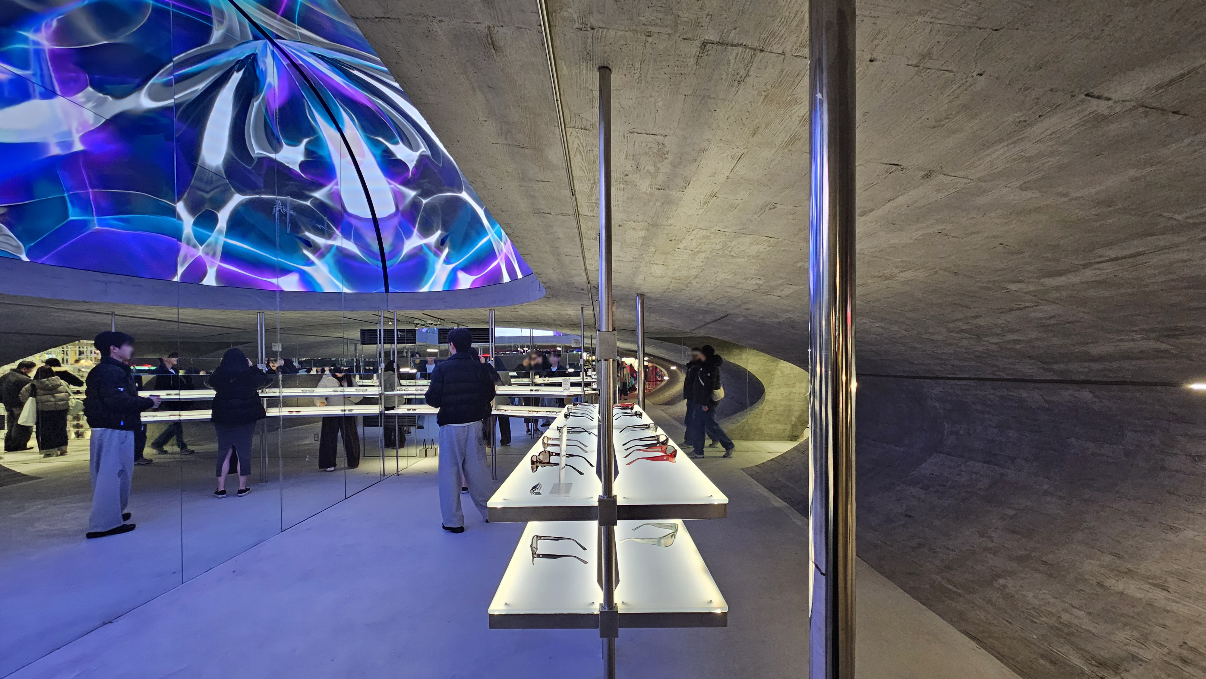 특히 매장의 심장부인 12m 크기의 '스피어(Sphere)'는 단순한 장식품이 아닙니다. 표면에서 끊임없이 재생되는 미디어 아트는 정적인 건축물을 살아 움직이는 유기체처럼 느껴지게 하죠. 고객은 안경을 고르기 위해 고개를 숙이는 대신, 압도적인 조형물을 보기 위해 고개를 듭니다. 쇼핑이라는 행위를 관람이라는 예술적 체험으로 어느새 바뀌죠. |