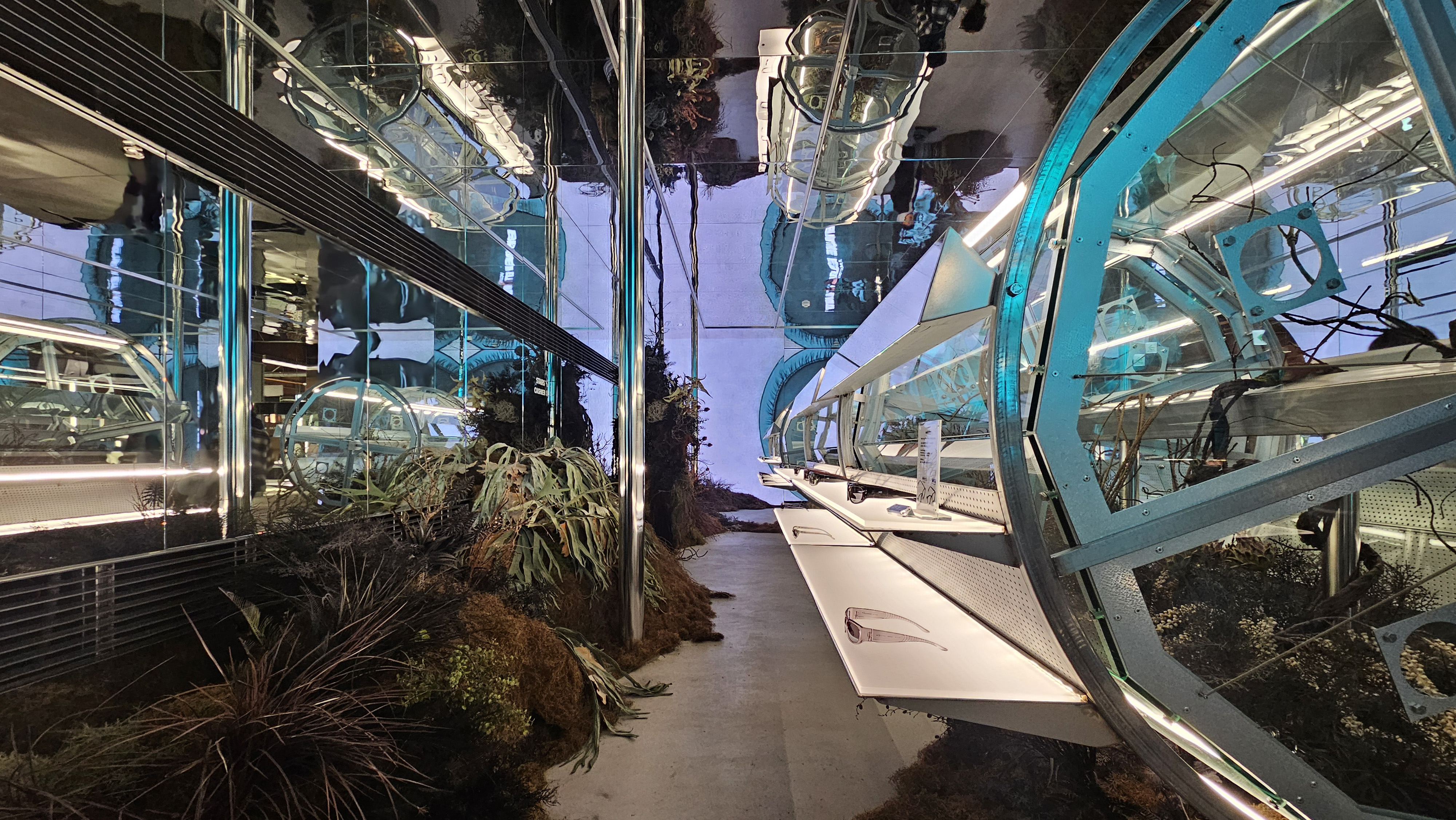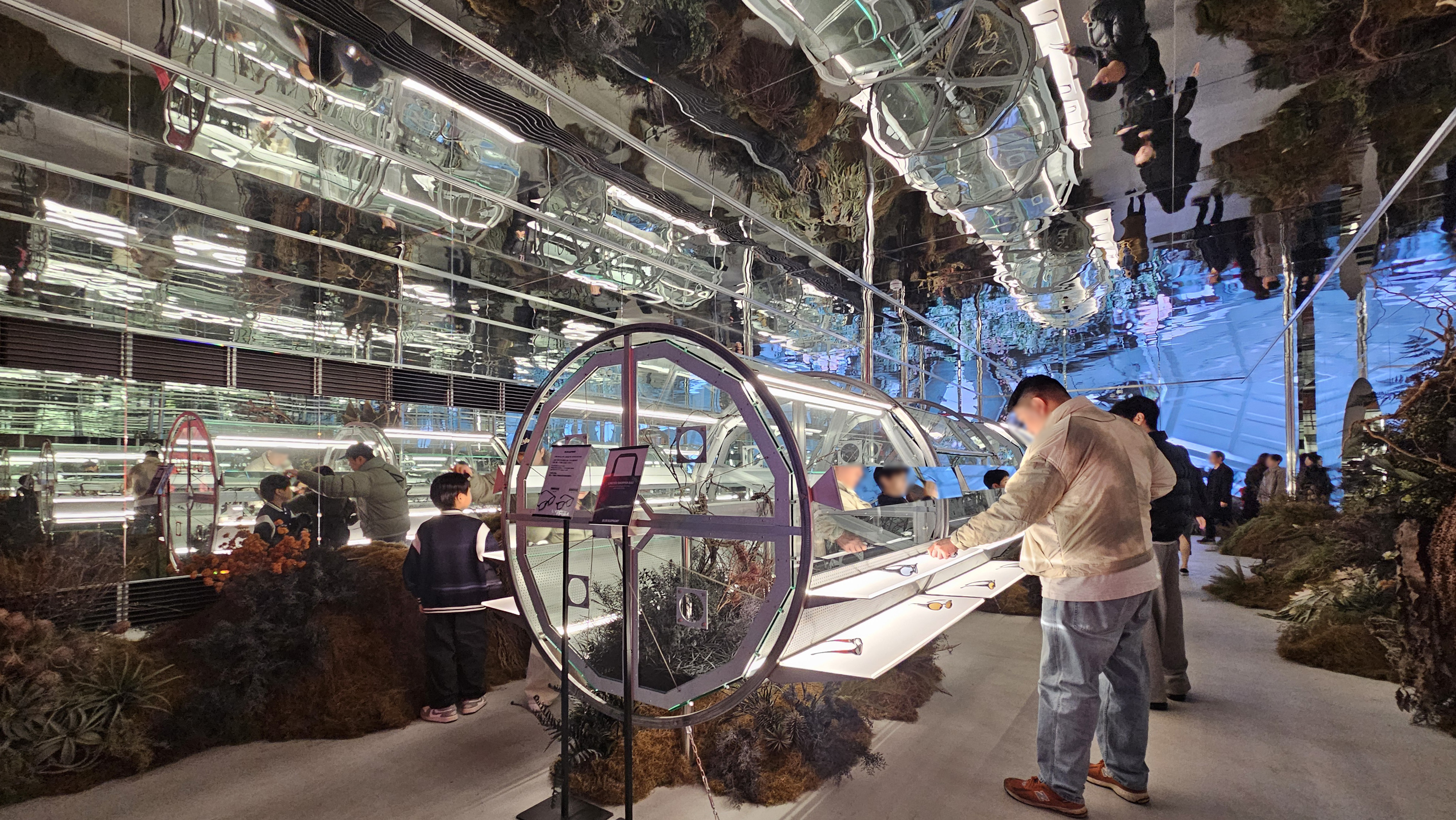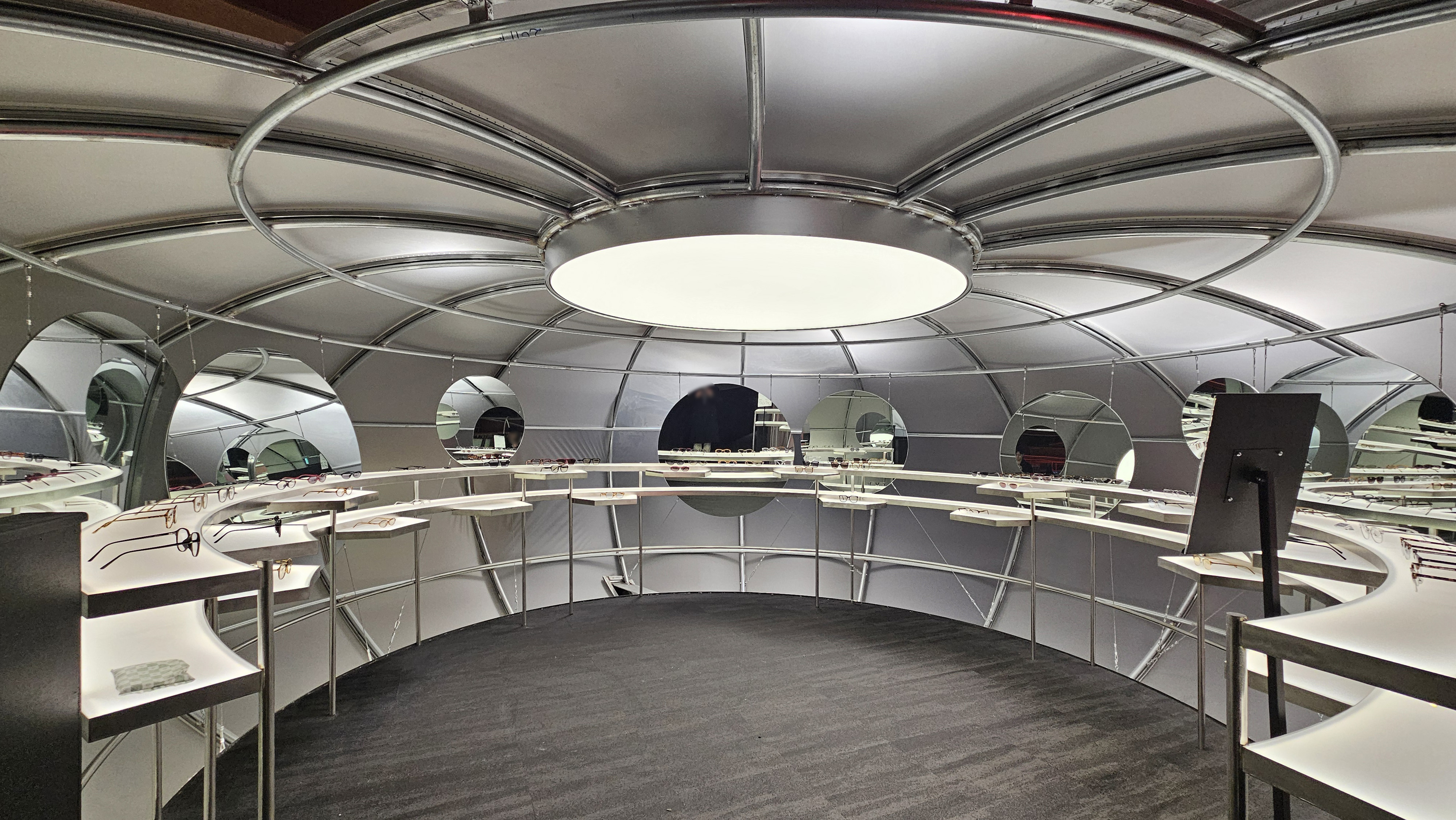 특히 매장의 심장부인 12m 크기의 '스피어(Sphere)'는 단순한 장식품이 아닙니다. 표면에서 끊임없이 재생되는 미디어 아트는 정적인 건축물을 살아 움직이는 유기체처럼 느껴지게 하죠. 고객은 안경을 고르기 위해 고개를 숙이는 대신, 압도적인 조형물을 보기 위해 고개를 듭니다. 쇼핑이라는 행위를 관람이라는 예술적 체험으로 어느새 바뀌죠. |