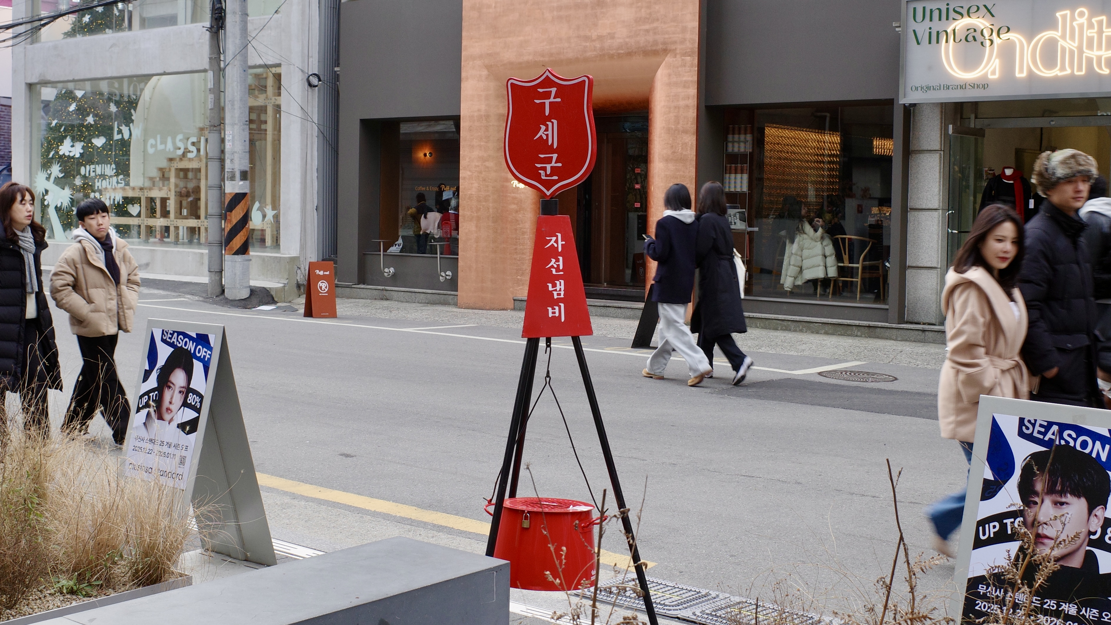 도시의 흐름을 방해하지 않으면서도, 사람들은 계획적으로 기부를 결심하기보다, 길을 걷다 우연히 자선냄비를 발견하고 잠시 멈춰 서서 동전을 넣습니다.