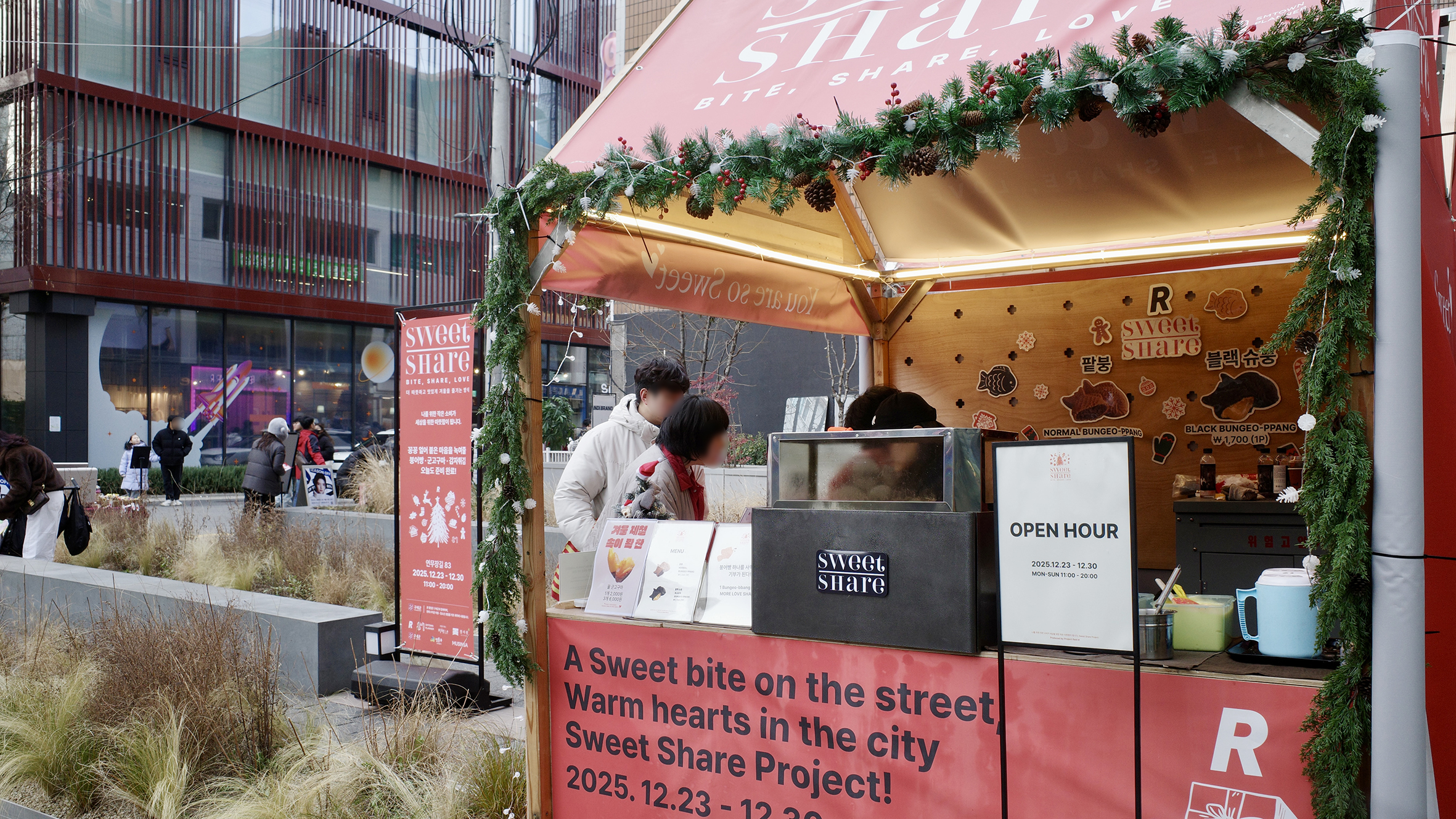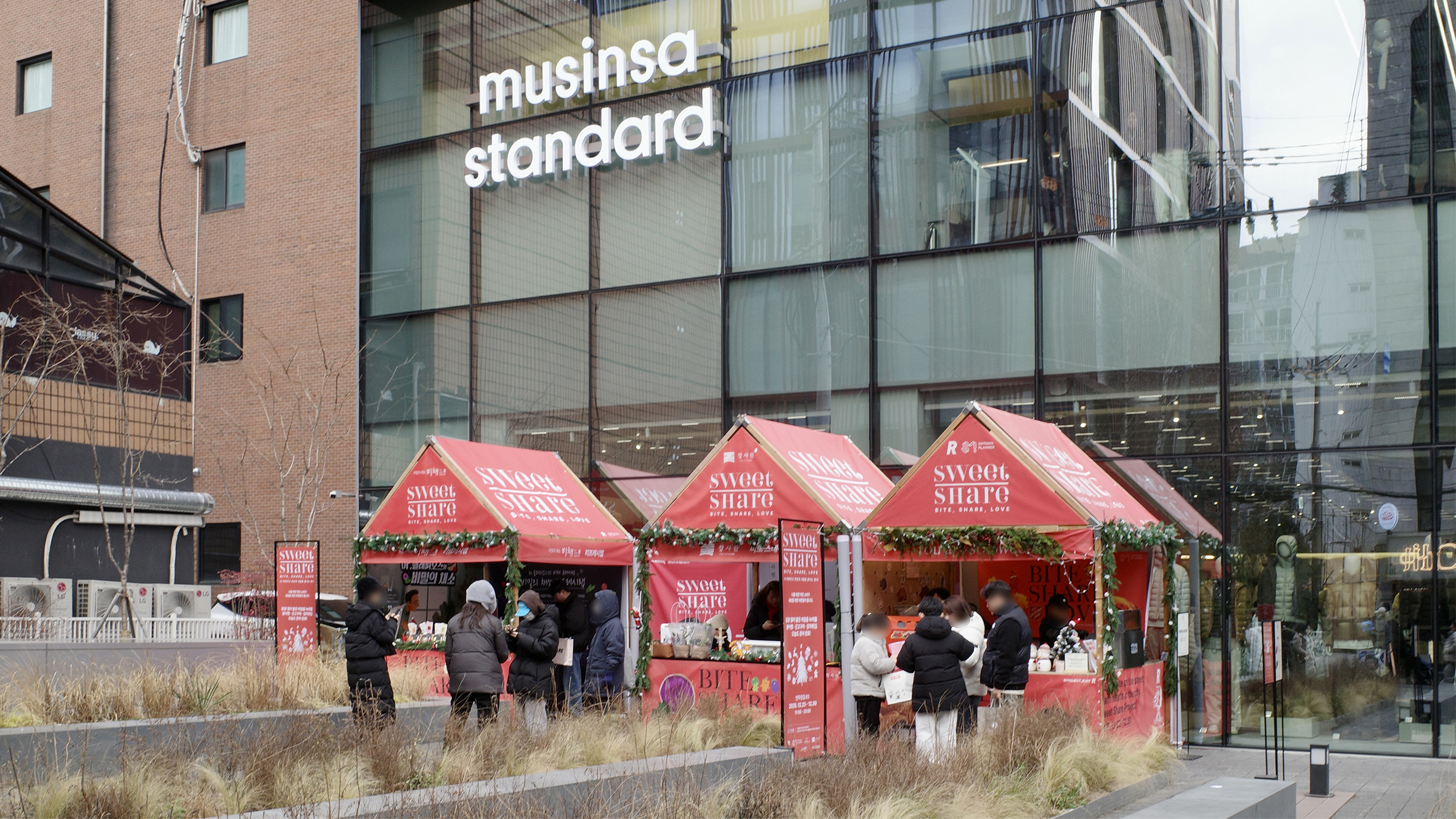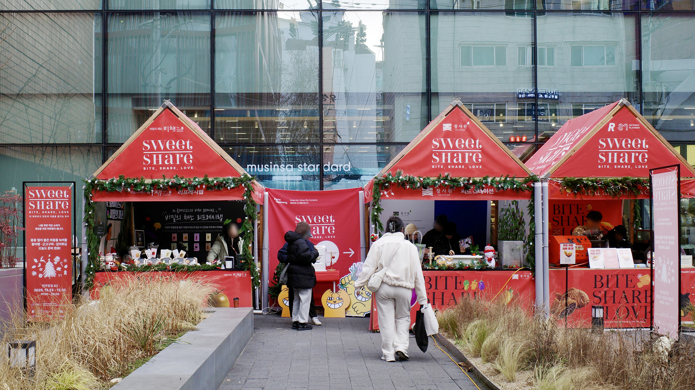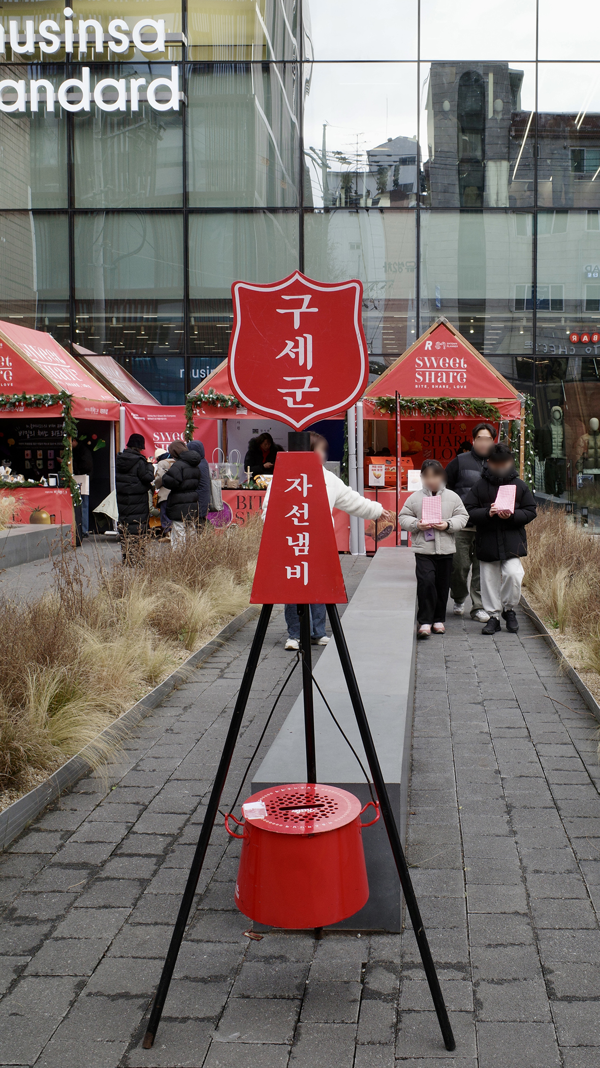 바로 구세군의 자선냄비입니다. 붉은 냄비와 종소리, 그리고 거리 한켠에 조용히 자리 잡은 모금 공간은 연말이 되면 자연스럽게 도시의 풍경 안으로 스며들었죠. 그 가운데 성수의 메인 스트리트에서 오픈한 Project Rent × SMTOWN PLANNER의 〈SWEET SHARE : 2025 Donation Project〉는 이 오래된 거리의 기억을 오늘의 성수, 그리고 공개공지라는 공간 위에서 다시 질문합니다.