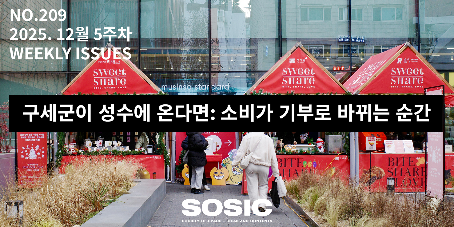 연말이 되면 성수는 서울에서 가장 많은 사람들이 오가는 거리 중 하나가 됩니다. 팝업 스토어와 브랜드 이벤트, 시즌 한정 콘텐츠가 끊임없이 열리며 성수는 연말 소비 문화가 가장 밀집된 도시 장면을 만들어내곤 하죠. 그러나 연말의 도시는 언제나 소비만으로 정의되진 않습니다. 사실 서울의 거리에는 오랫동안 반복되어 온 또 하나의 연말 풍경이 존재합니다.