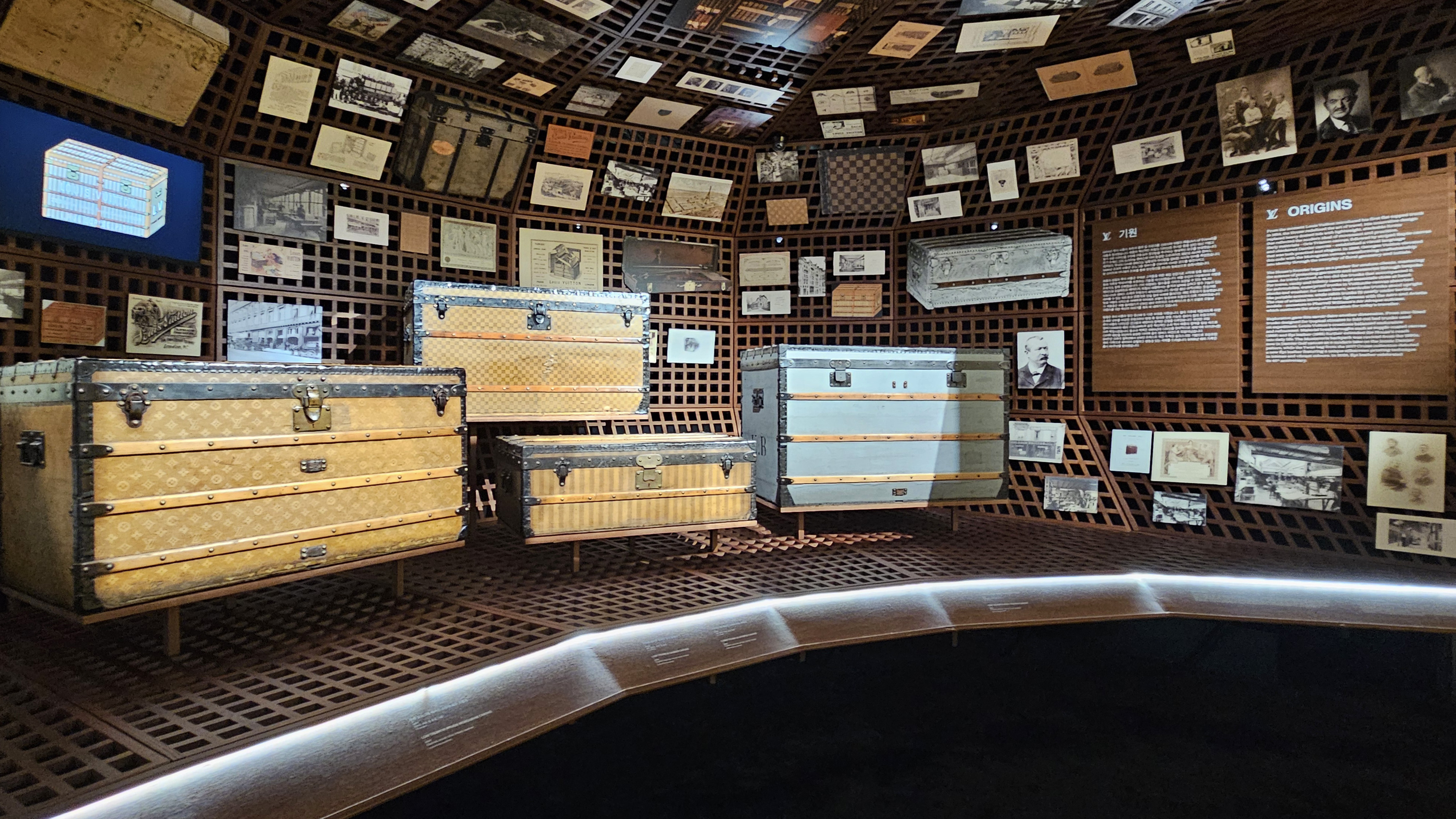 전시의 시작인 5층은 루이 비통의 뿌리(Roots)를 탐색하는 공간인데요. 여섯 개의 챕터로 나뉜 이곳은 브랜드의 진화 과정과 오리진을 한 편의 다큐멘터리처럼 보여주죠. 1896년 조르주 비통이 아버지를 기리며 창조한 모노그램 캔버스의 탄생 설화가 펼쳐집니다. 증기선, 기차, 자동차 등 교통수단의 발달에 맞춰, 옷장에서 여행 가방으로 진화해 온 트렁크의 역사를 살펴보게 되죠. |