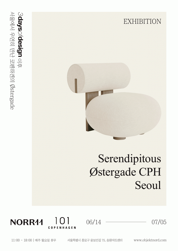 서울 북촌의 송원아트센터에서 덴마크 코펜하겐 가구 <SERENDIPITOUS ØSTERGADE CPH SEOUL>이 열리고 있습니다. 이번 전시는 코펜하겐의 중심에 위치한 Østergade 거리의 스칸디나비아 디자인을 서울의 갤러리 공간에 재현한 것으로, 예기치 못하게 발견하는 디자인의 즐거움을 선사하죠!